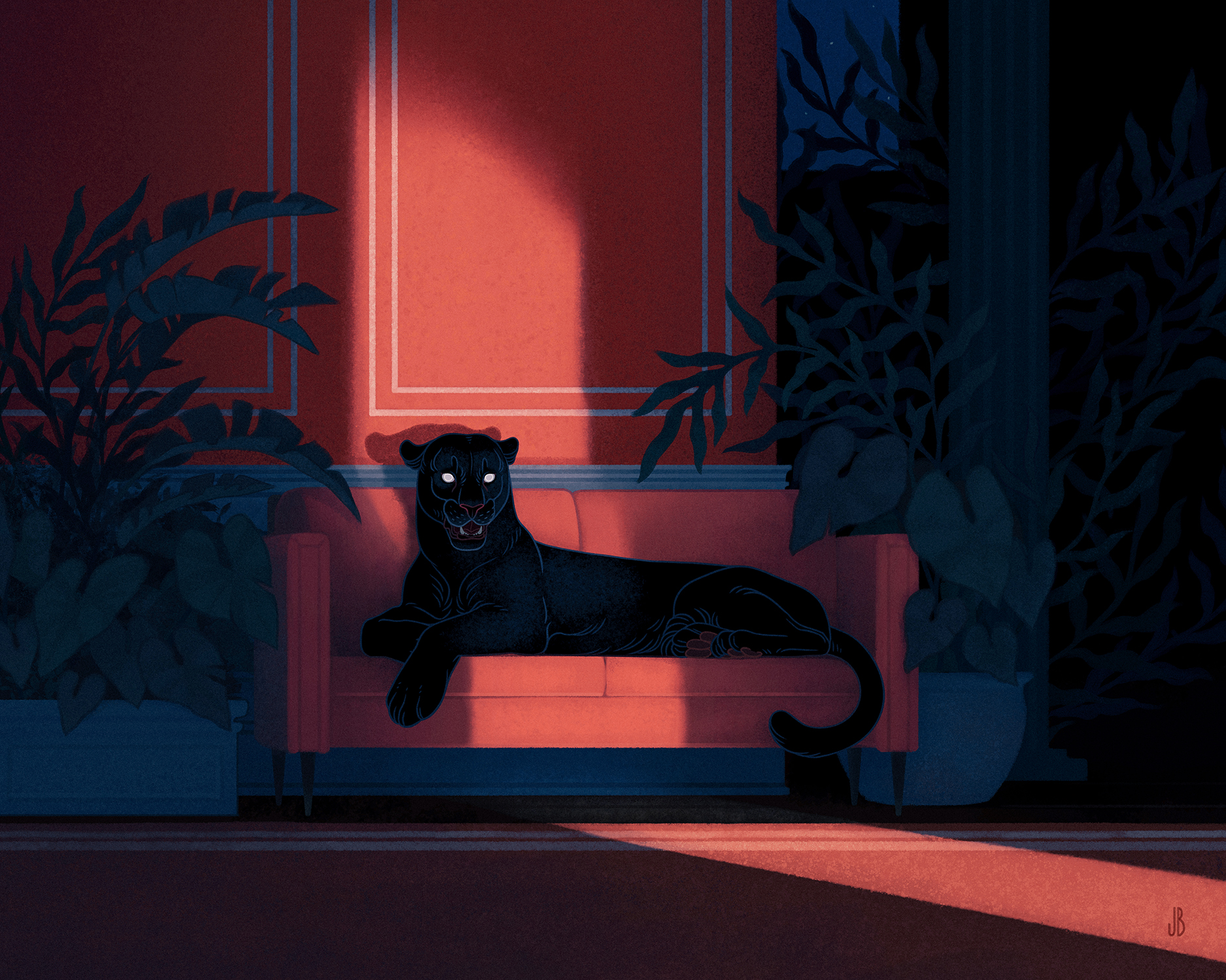 You see them the moment you step in the room — two silvery eyes that flash bright in the gloom. -- Art print on thick, archival matte paper