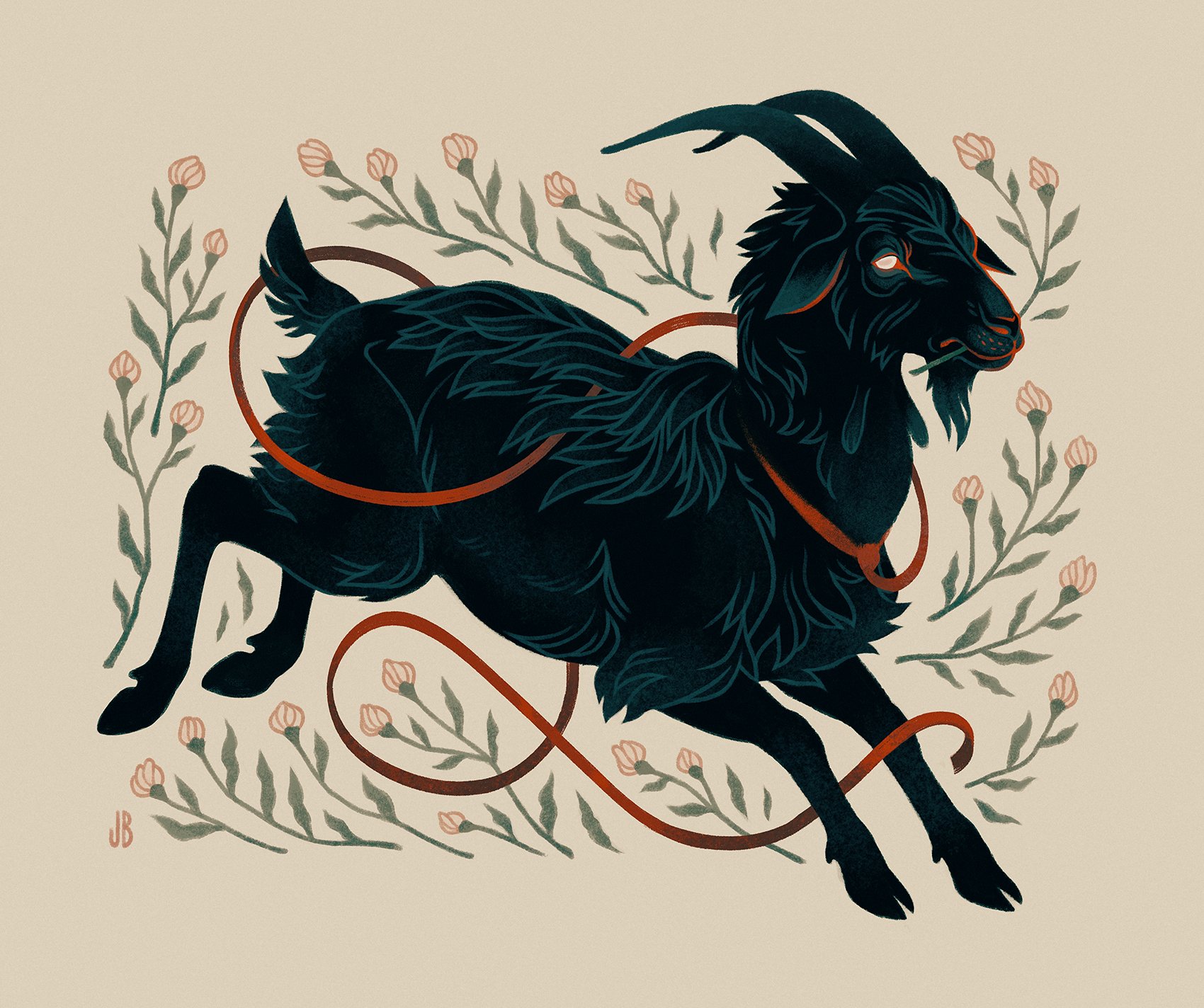Black goat in the dying garden, prince of cloven feet. -- Art print on thick, archival matte paper.