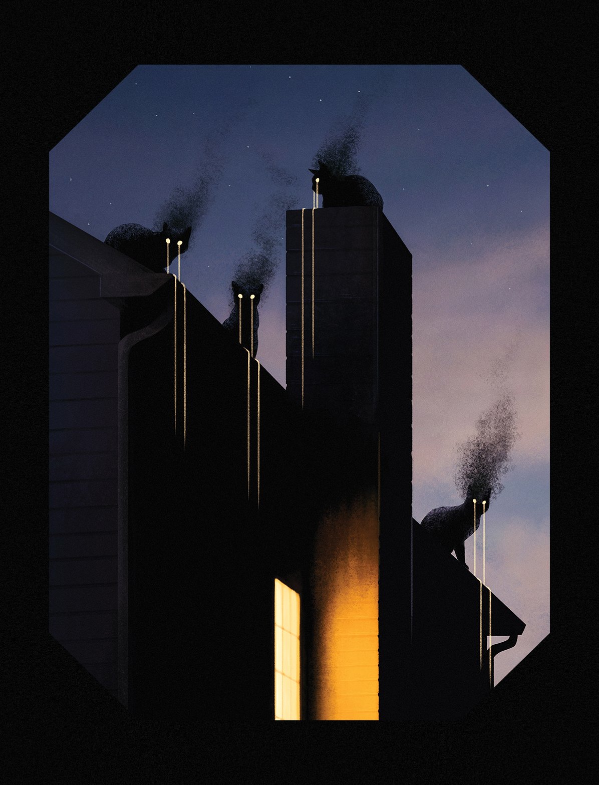 Strange omens gather at the end of the street. -- Wearable art print on a warm pullover sweatshirt. 50/50 cotton-polyester.