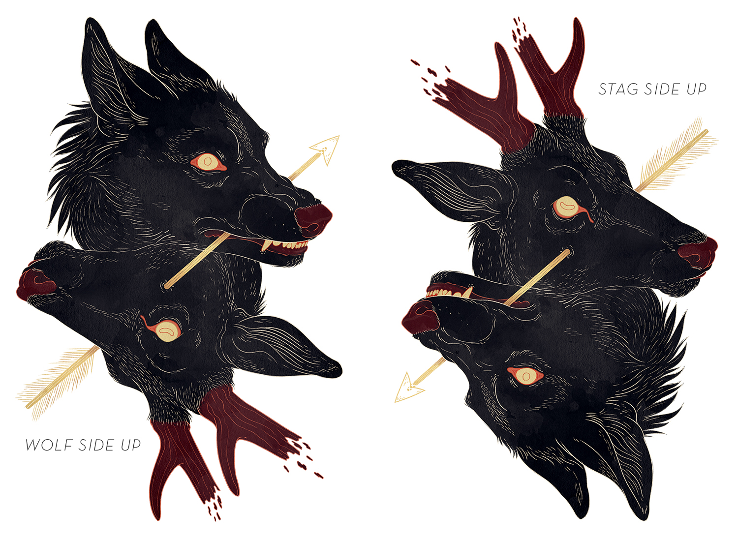 Wearable art print on a classic, soft t-shirt. 100% cotton. The artwork on this shirt is designed so it can be viewed either with the wolf's head on top, or the stag's head. You can select which you would prefer when picking your size!