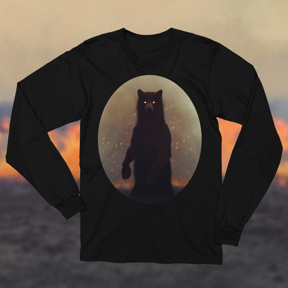 Another world gazes through grease and smoke. -- Wearable art print on a soft, long-sleeve t-shirt. 100% cotton.
